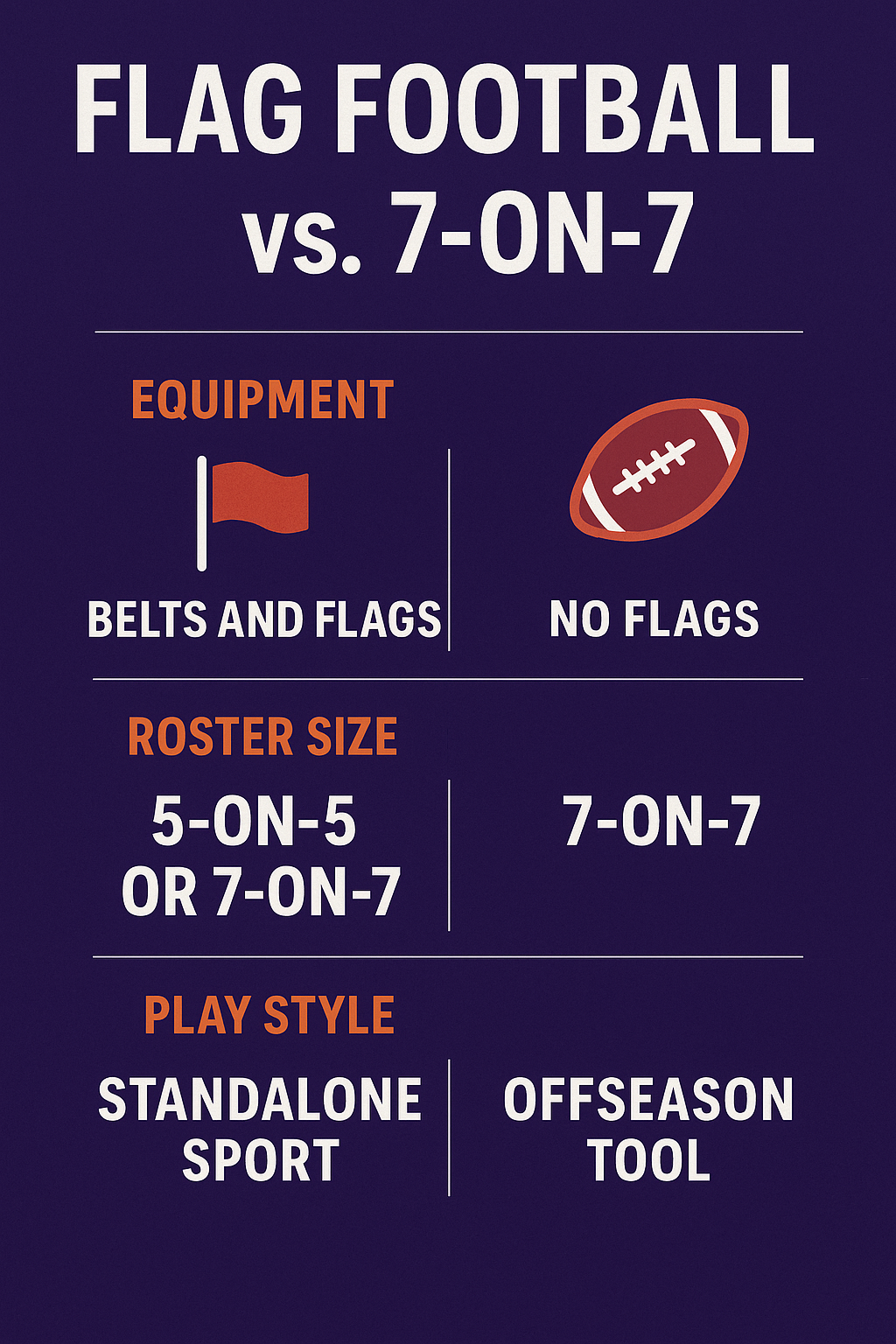 - 7-on-7 is strictly seven players per side and usually mirrors tackle football positions.