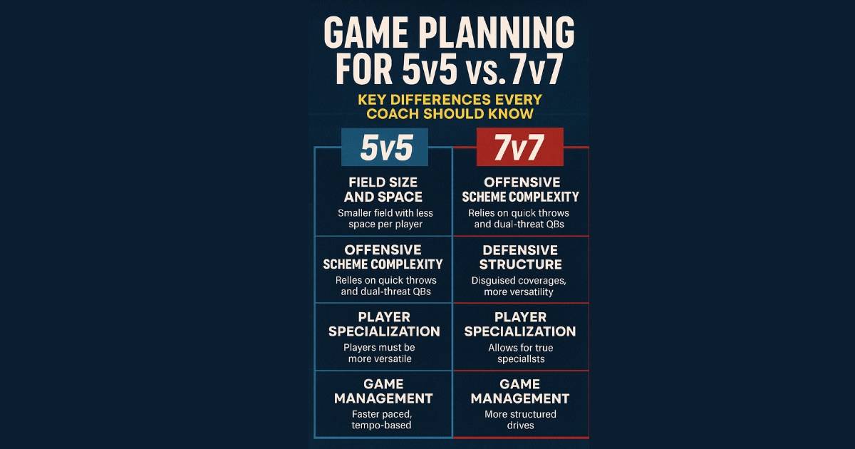 Coaching Tip: In 5v5, quick passes and short routes thrive. In 7v7, stretch the field with layered route trees.